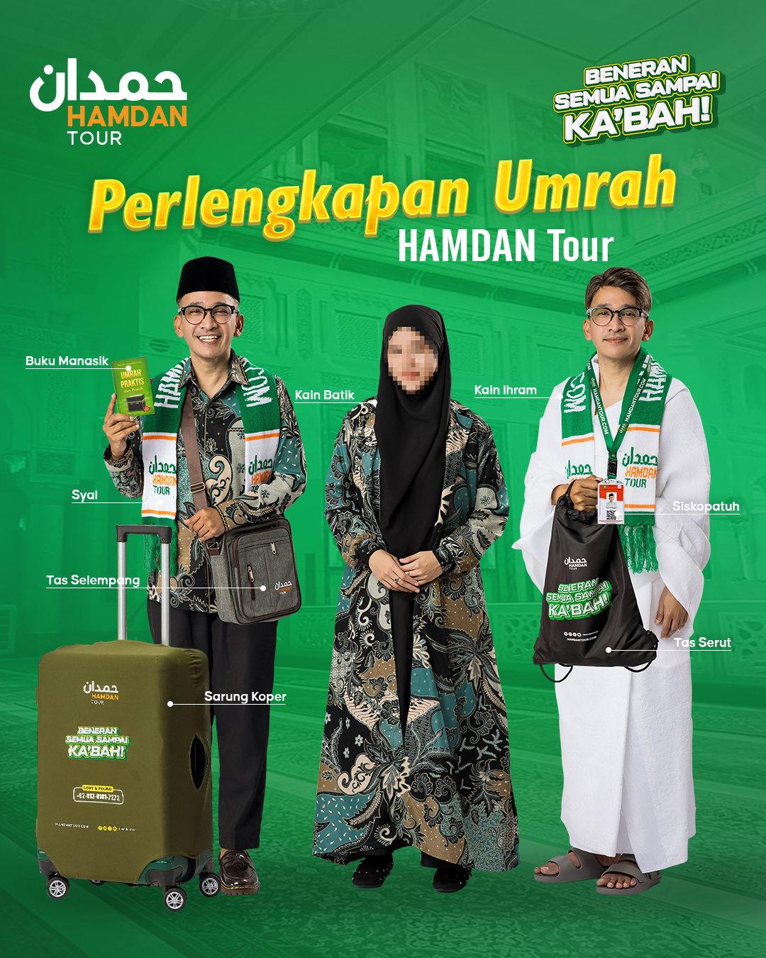 🔰 Perlengkapan Umrah (Kain batik, tas serut, tas selempang, buku manasik, kain ihram / mukena, syal, sarung koper, id card, lanyard).